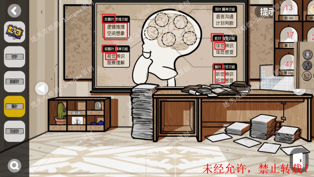 118.查看地上的一摞纸,拾取【枕叶金属牌】,点击桌子上的元素表,拾取【后额叶金属片】。118