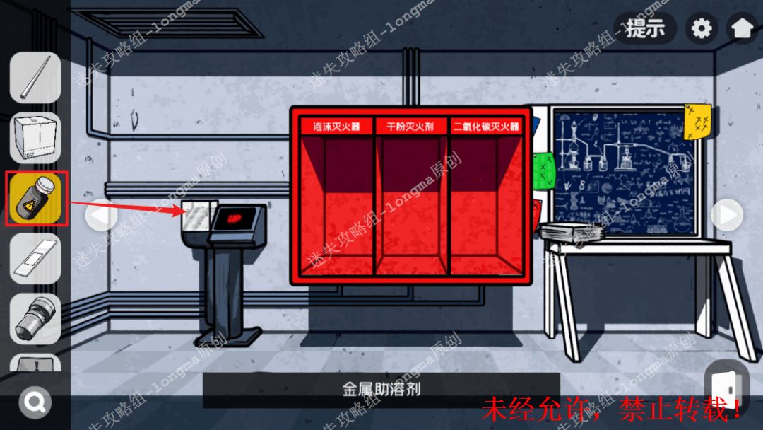 147.右转至实验室,查看实验器具,使用【滴管】对照黑板上符号位置,将符号对应试管中的液体加入到实验中,获得【金属助溶剂】。147
