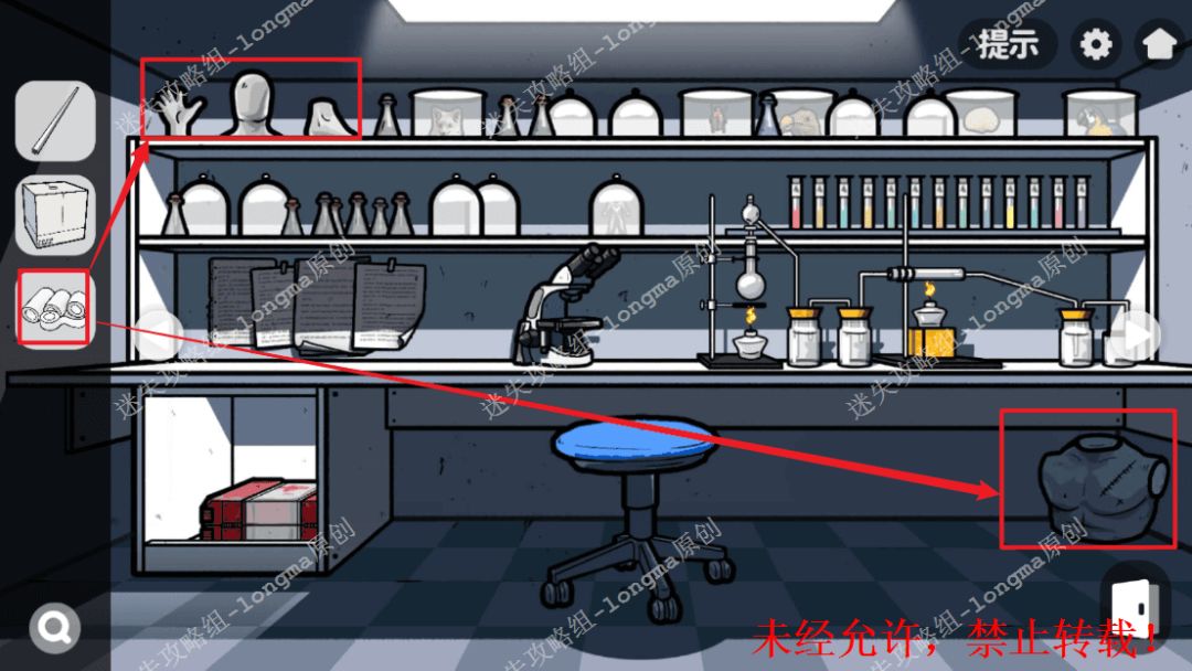 145.右转至标本室,查看左边柜子,对照雕像处密码“手-9、胸-8、脚-2、头-5”打开柜子,获得滴管。145