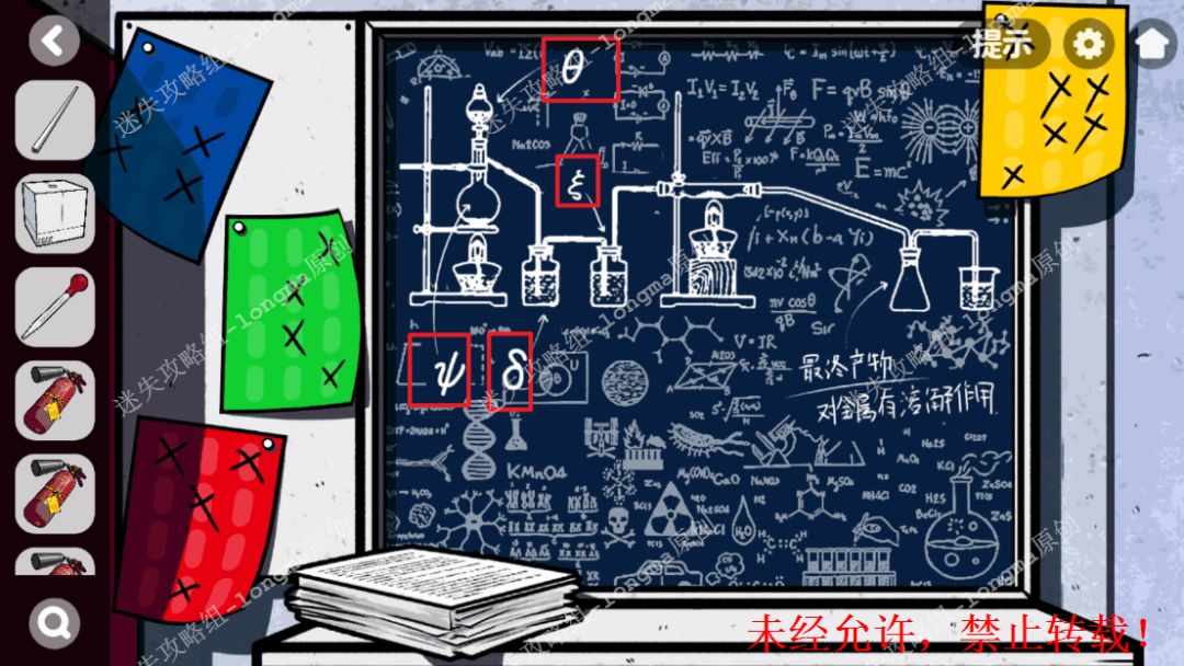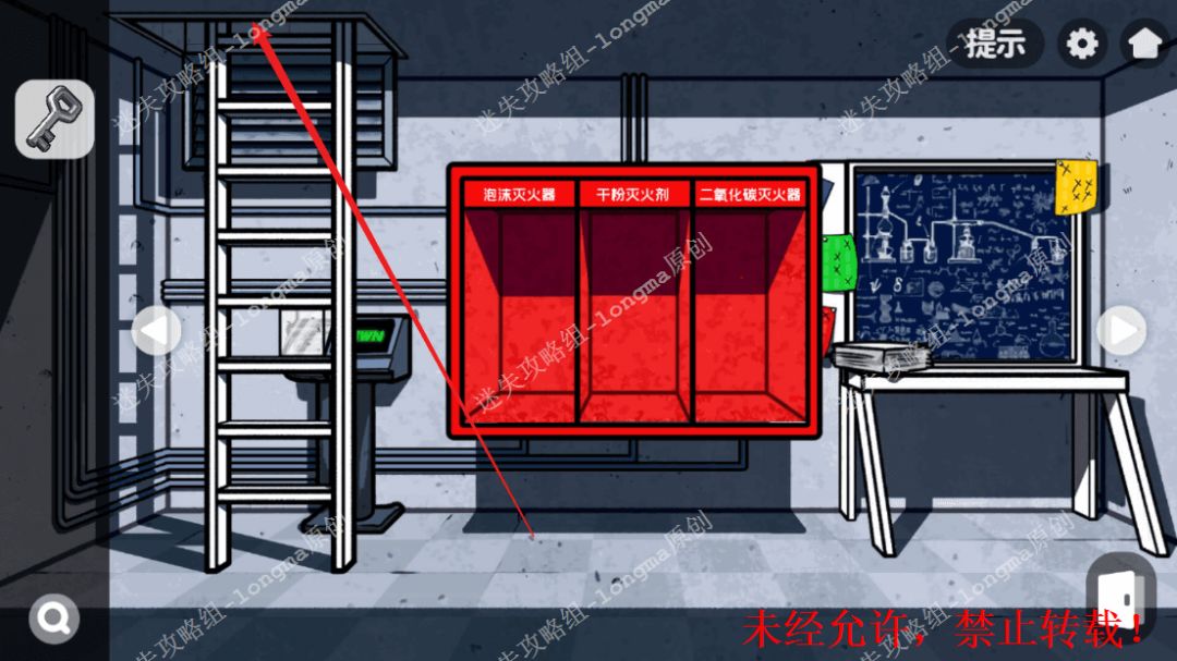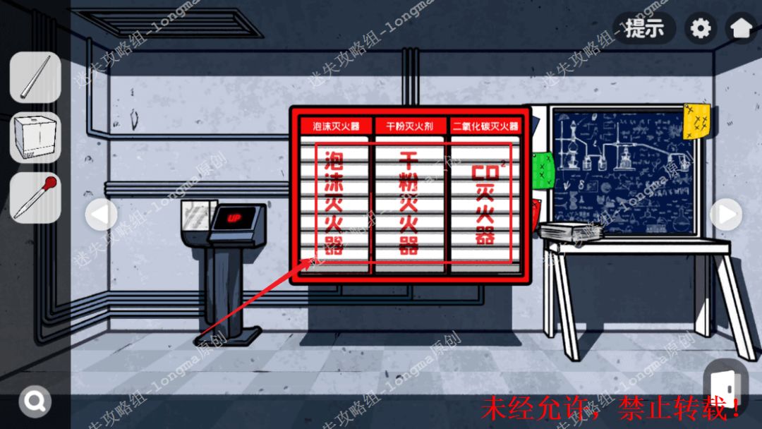 146.右转至灭火器房间,拿走三个【灭火器】,查看右边黑板,记住黑板中每个特殊符号对应的位置。146 146.1