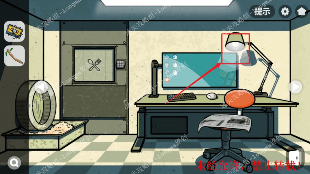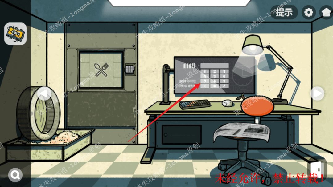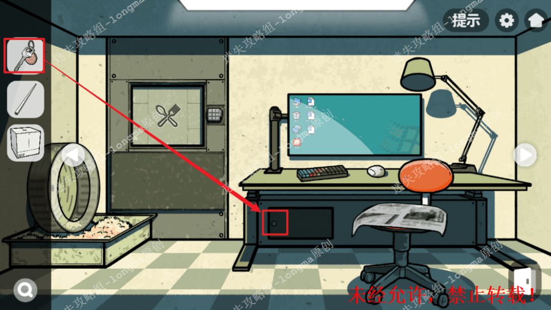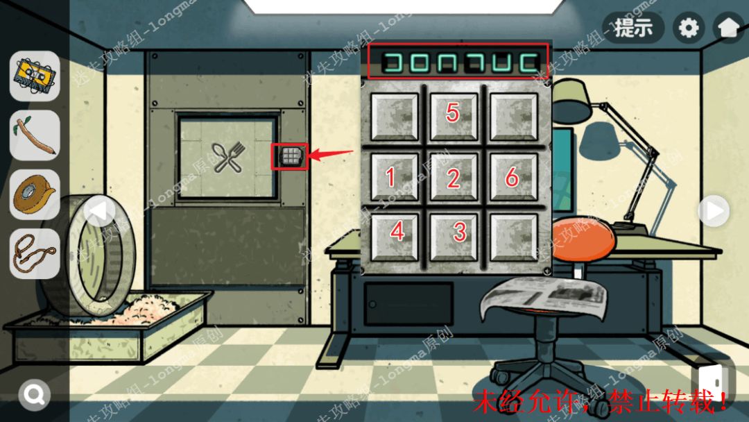 133.左转至仓鼠房间,查看左边的门锁,对照LED灯图案,依次点击每个图案对应的位置,打开暗格获得【院长钥匙】【一袋瓜子】【一根筷子】。133