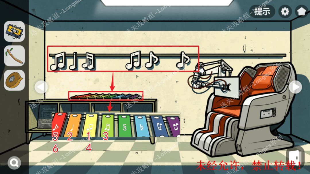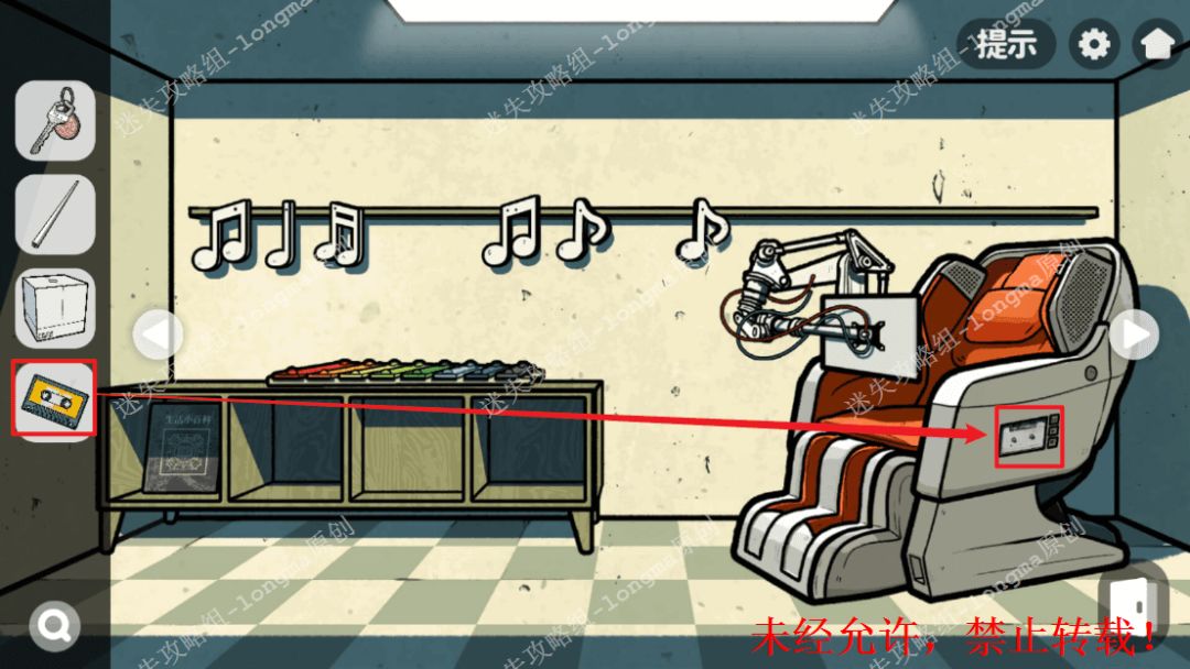 130.右转来到有音符的房间,对照墙上的音符,依次敲击下面对应的符号,打开抽屉获得【铜丝】。130