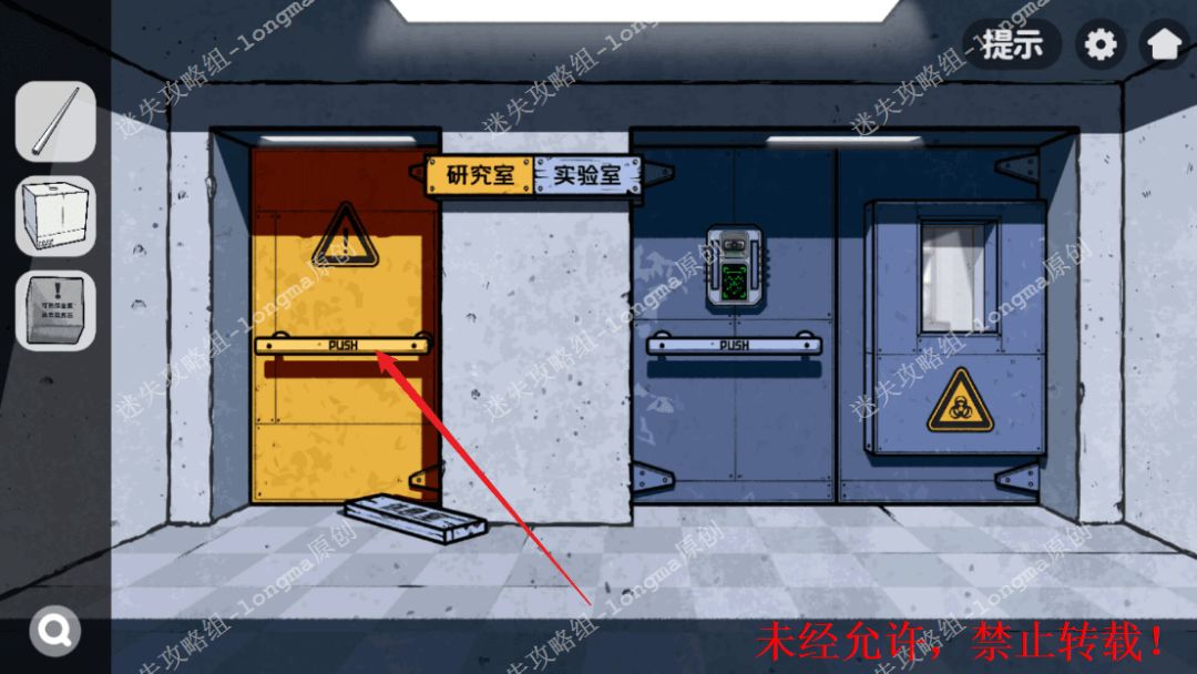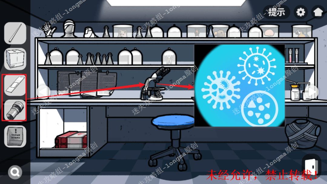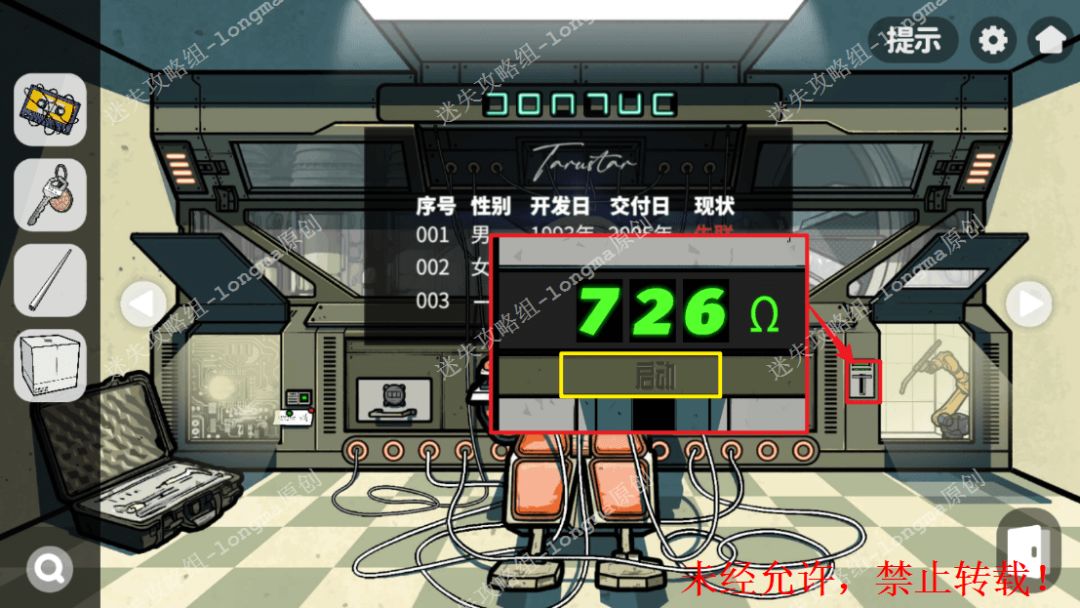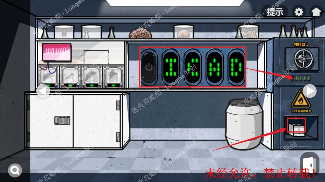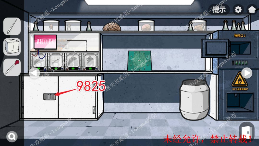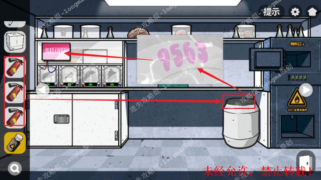 148.右转,对白桶使用【灭火器】,记住上面复现的数字“9563”,在左边的红色屏幕上输入数字解锁,点击左边两个格子获得【可溶金属】【显微镜倍镜】,右边输入“805”,获得【载玻片】。148