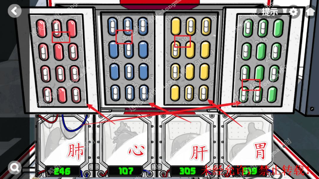 159.对照之前红色屏幕下内脏标本的数字,得知每种颜色药物对应的内脏“红-心、蓝-肝、黄-胃、绿-肺”。159