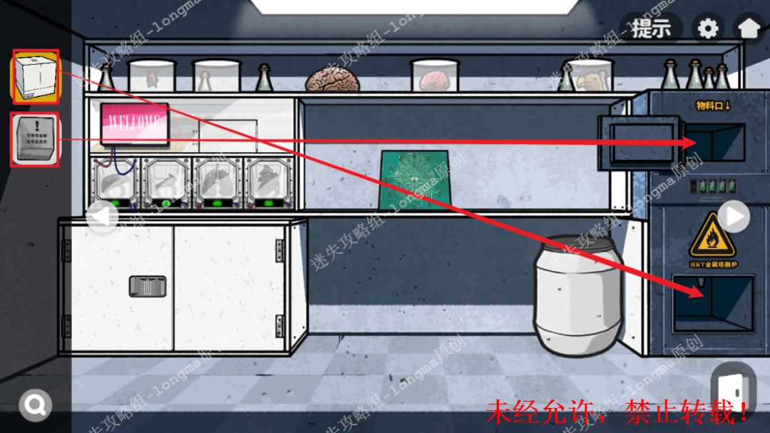 156.左转至标本室,将【可溶金属】放在右边物料口,【钥匙模具】放在下面。156