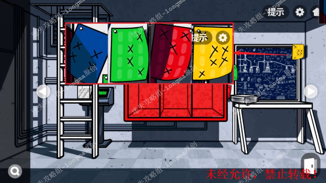 157.右转至消防箱房间,查看黑板,记住黑板周五彩纸上“×”的位置。157