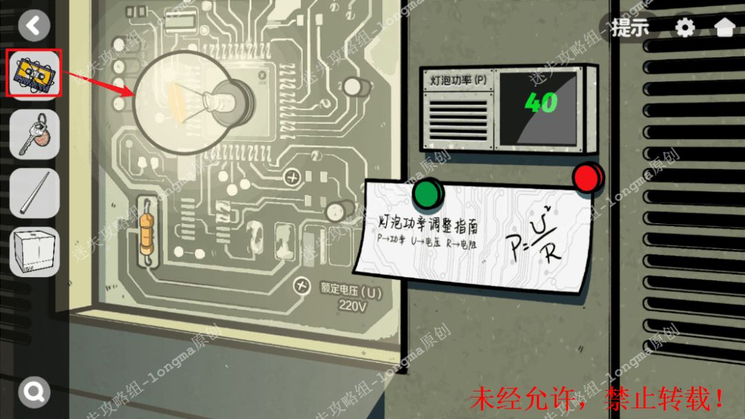 129.右转,拾取左边工具箱上的【胶带】,将【灯泡】安装在机器左边的线路板上。129