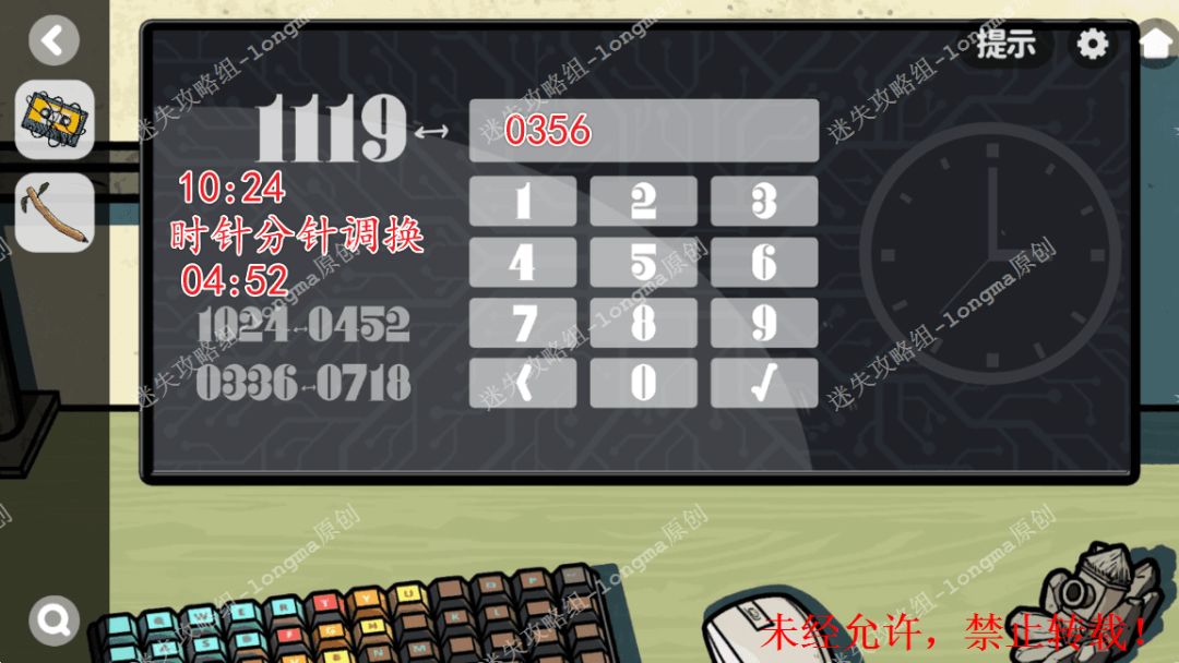 126.对照屏幕左边数字信息,得出密码“0356”(从左下角数字中可以看出左边数字代表的时间,分针和时针调换后就是右边数字代表的时间,所以11:19时针分针调换后对应03:56),输入密码,解锁屏幕。126