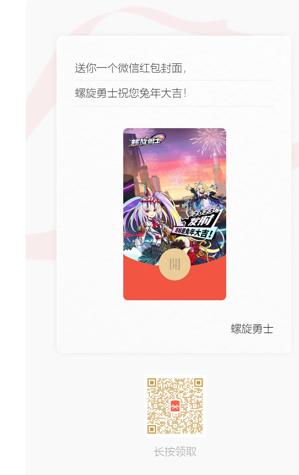 《螺旋勇士》希望大家能开开心心过大年,特此奉上定制红包封面,请各位陀螺手扫码领取(悄眯眯:关注螺旋勇士公众号也可领取封面噢~)