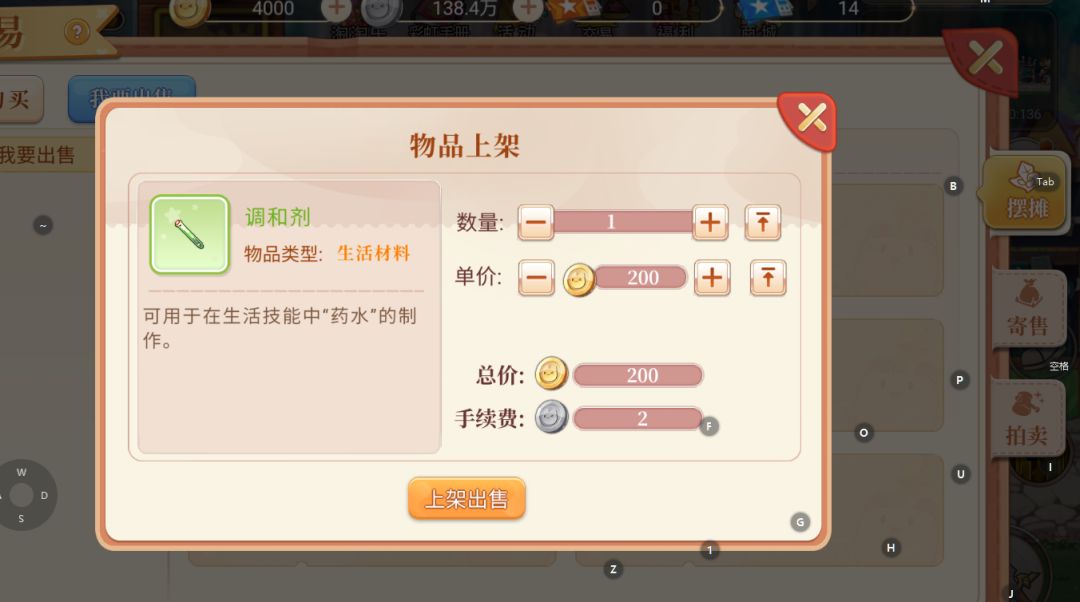 材料我们可以制造大量调和剂来进行上架,在其他聊天渠道和商人达成一个共同的上架数量,之后商人会购买这个商量好的数量的物品,这样金币就会进入你的邮箱之中!PS:交易有风险,交易最好是在到货再付款!如果有商人让你先付钱再出金大概率是骗钱!等金币到账之后再付款!