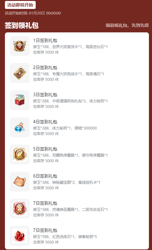 活动期间累积签到满7天,即可获得对应天数礼包,签满七天领取限量好礼先到先得!