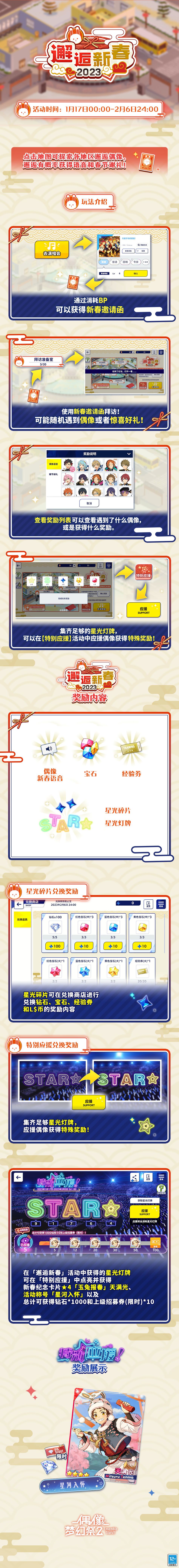通过【邂逅新春】活动和每日分享中收集S/T/A/R/☆灯牌,集齐STAR☆5个不同的灯牌后,消耗灯牌即可进行一次应援,应援达到一定次数即可获得钻石、【上级招募券(限时)】、★4【玉兔报春】天满光、称号【星河入怀】等丰厚奖励。