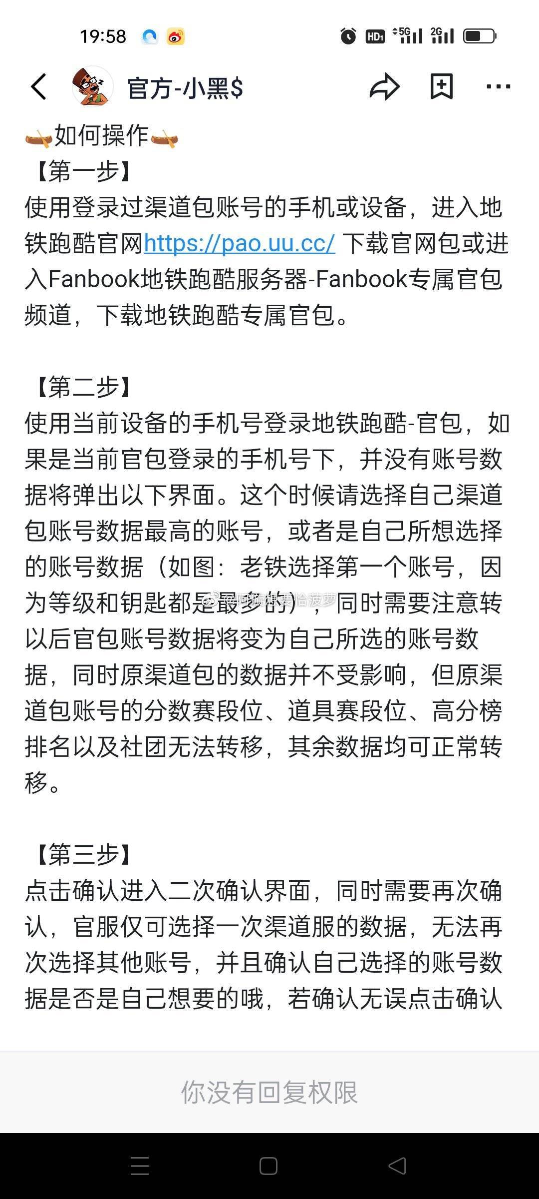 去地铁酷跑官网下载安装包(注意是那个英文的),然后用渠道服登录的手机号去登录(如果是QQ登录就要QQ登录那个手机号),进去之后会弹出来账号选择,一定要看选择你之前账号呢称的那个(这个方法会导致分数赛和道具赛排名清零),来源忘了是哪看到的了,只保存了图片。