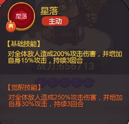 对全体敌人造成200%攻击伤害,觉醒之后增加50%,对于全体技能来说伤害还是挺可观的,并增加自身15%攻击,持续3回合,觉醒之后增加到30%,作为输出技能,数值还是挺高的。