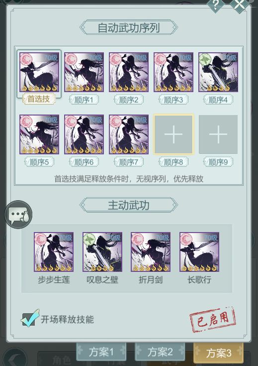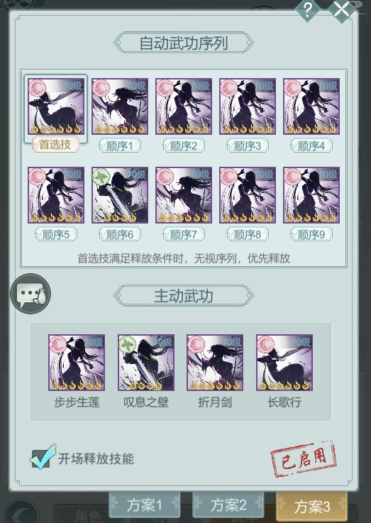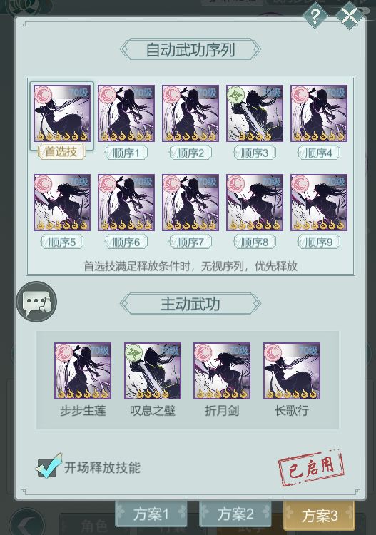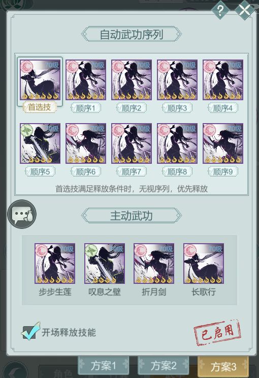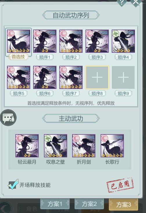 叹息锁月很多轴(自动武功序列),列举一下不同时间释放的叹息锁月轴,剑式可搭配4桃花,4佛渡,4魔刃。经脉都是8剑意开局释放,不选开局释放的话,可以考虑剑意4回一,可自行探索。开局不释放的可自行探索。