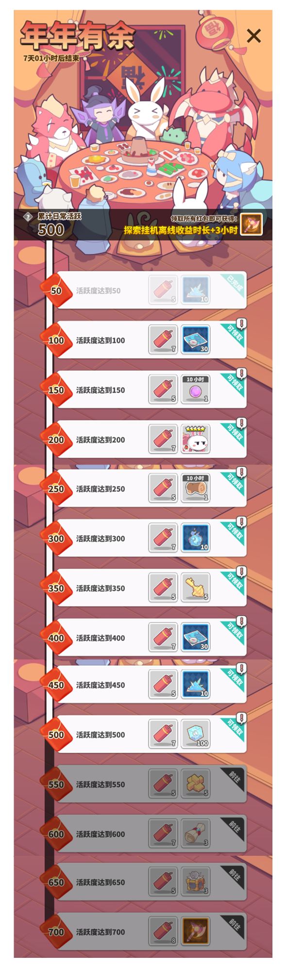 🎈在活动持续时间内,登陆游戏并完成每日任务,累计活跃度,达到指定档位即可获得大量鞭炮等奖励。