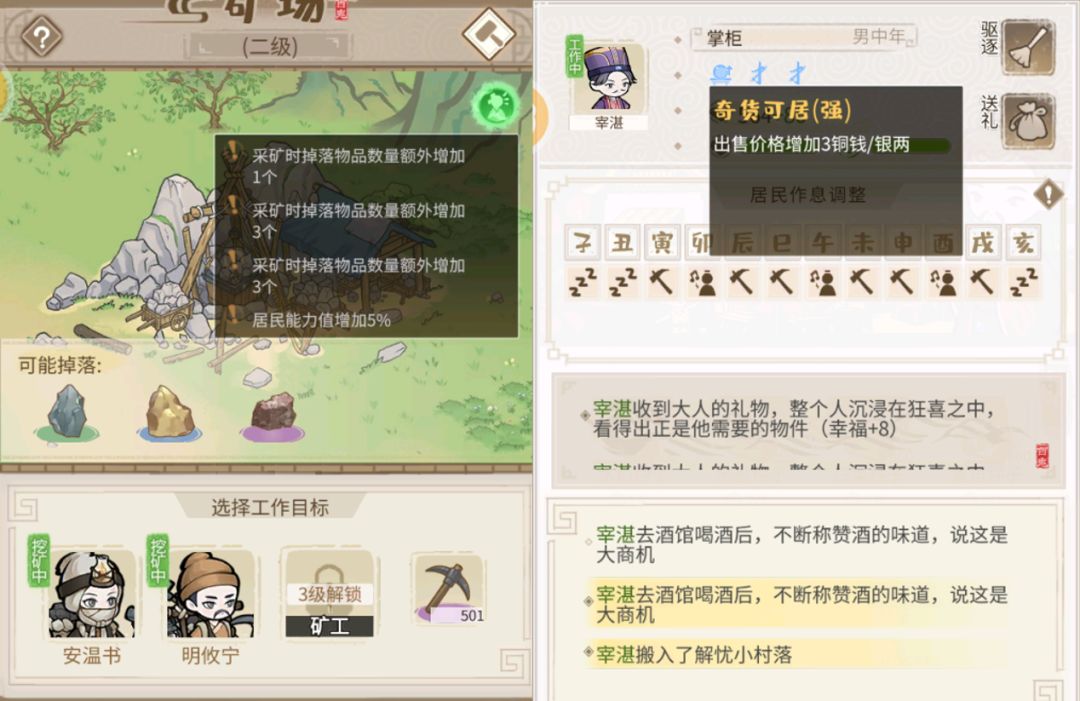 ③每个居民都有自己的作息时间表。基本上都是干6个时辰,歇6个时辰。但是鬼怪是24h干活。所以我们在选择的时候,如果普通居民没啥好用的技能,我们可优先选择鬼怪。但是鬼怪前期较弱,妖力(相当于居民的能力值)也很低,可用猪粪等用不上的材料培养至10级好感度,再将其拉到10级500妖力(相当于普通居民的能力值上限了)。