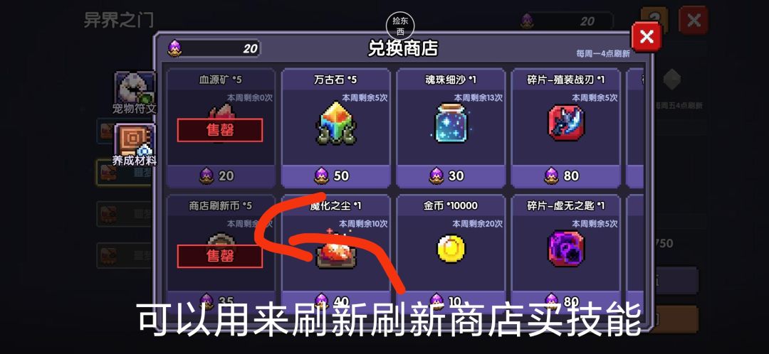 第二天按照进度可以推到50层就推不到了。40层解锁异界记得去打,打噩梦,噩梦1伤害不够的,试用装随便用。然后去换刷新币可以拿去刷新买技能后续会说!