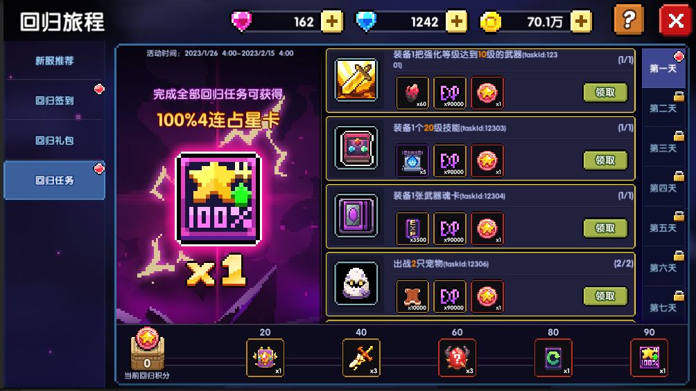 活动期间,完成宠物培养任务即可获得狗粮(小)奖励。