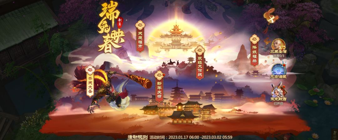 本次活动主要分为了七个部分:齐天大圣、降妖福册、天庭福市、龙宫海藏、取经大作战、玉兔献吉、新年庆榜