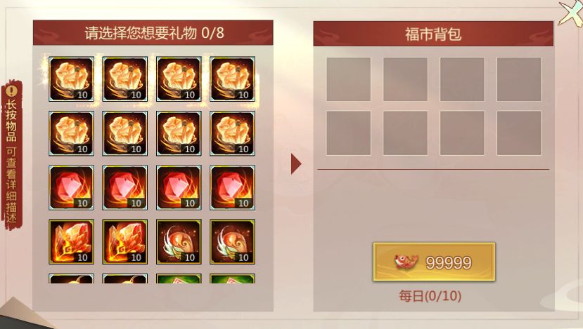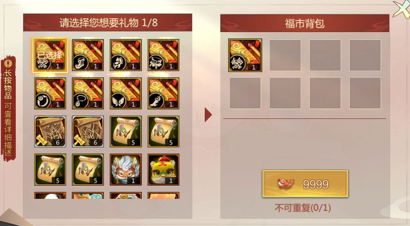 梦梦下面为大家随机展示其中一个灯笼:仙术师可以从左侧礼品栏中选择自己想要的8个礼物,放入右侧的福市背包,最后再花费部分福鱼就可以把奖励带回家啦~