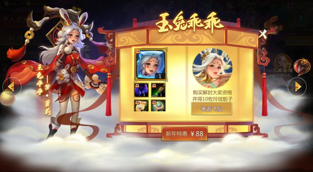 值得一提的是玉兔乖乖礼包可以解锁飞仙画壁额外奖励资格,大家可以在活动获得梦*萝莉的两款飞仙换装。