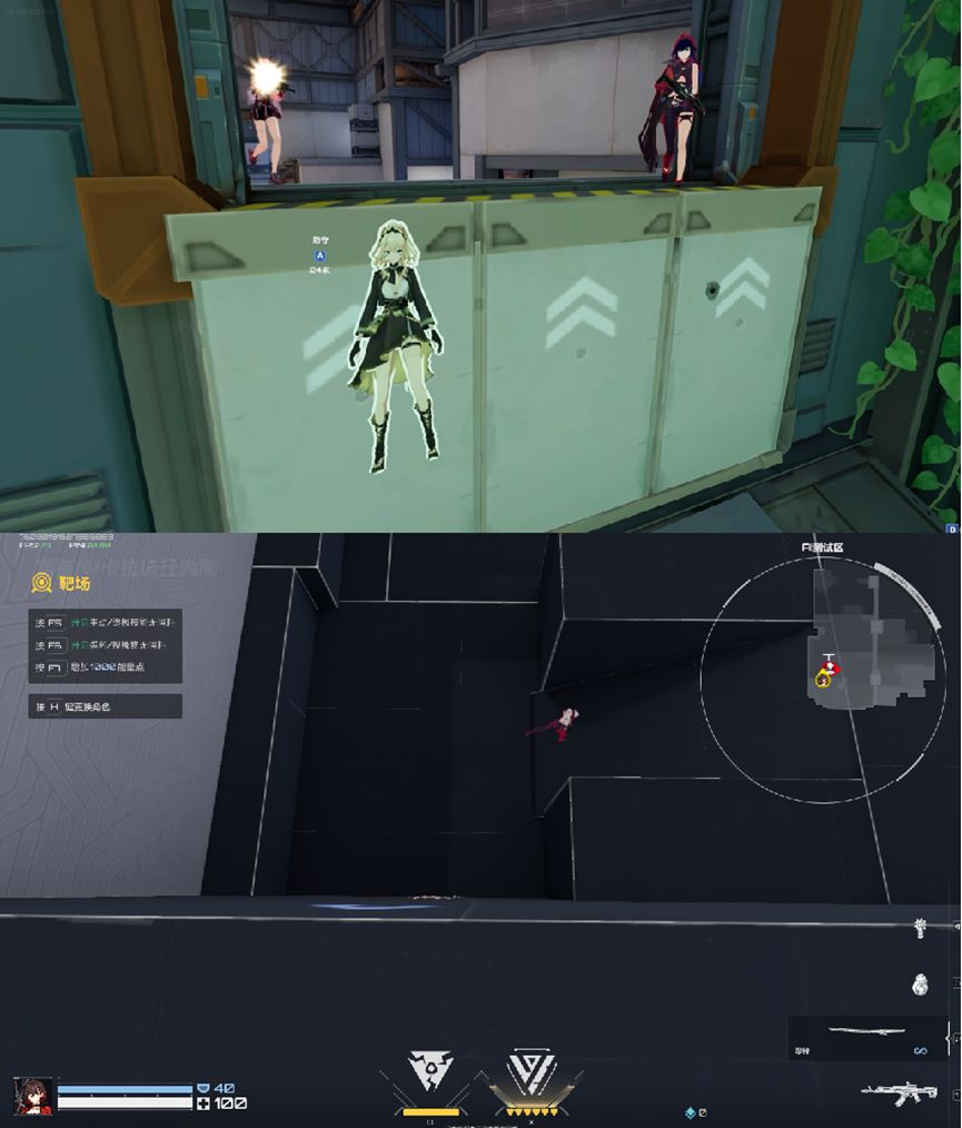 1. 卡窗口:对于一款射击类游戏而言信息的收集是非常重要的,所以能灵活运用弦化机制往往可以在一些出人意料的地方先发制人,比如合理利用窗口外侧墙面,配合第三人称的视角可以很安全的观察到周围敌人的信息以便先手,而不利用弦化操作相信熟悉fps游戏的人就会比较了解如果我们在下方就会很容易因为3D模型的限制而暴露自己