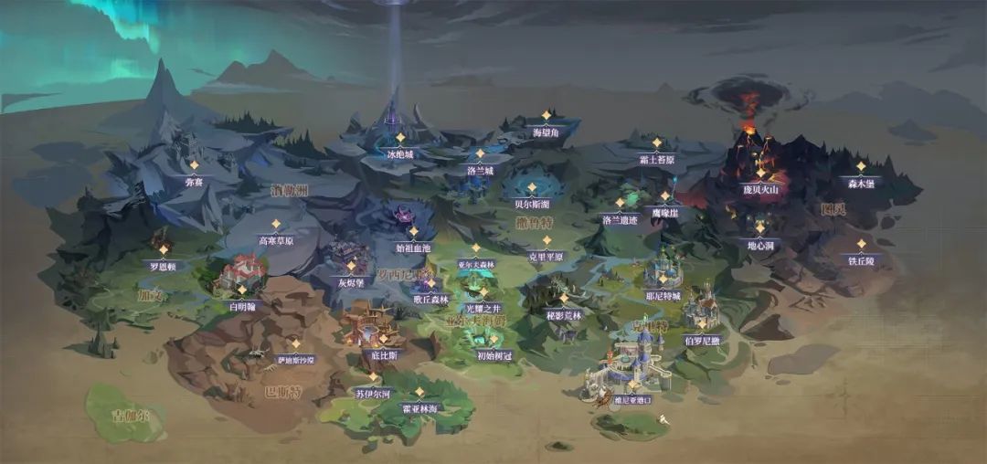提亚大陆由加文、图灵、罗西尼亚、撒鲁特、泊勒洲等多个地区组成。