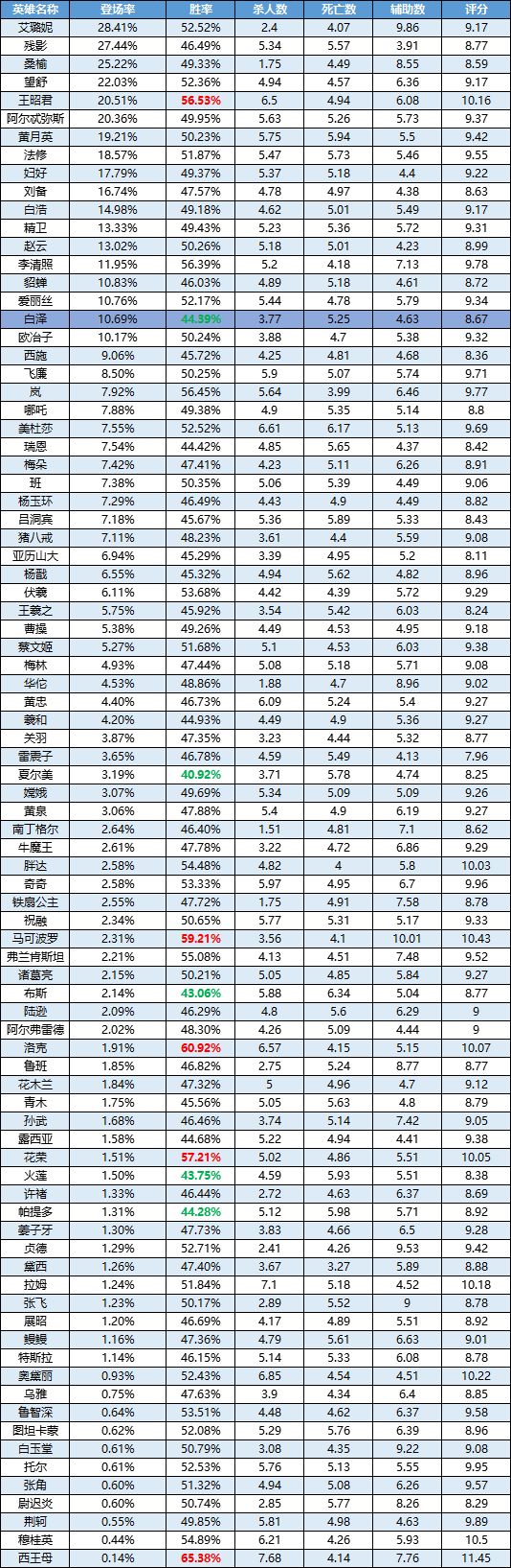注:此榜单按出场率由高到低排序,标红为胜率前5的英雄,标绿为胜率排名倒数的英雄