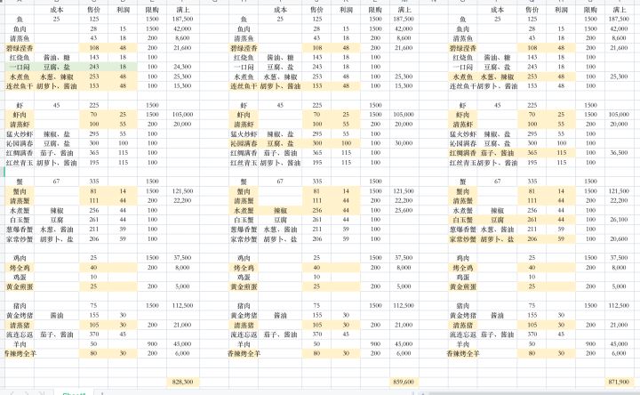 所以在最理想的状态下(产量超量达标),就鱼虾蟹鸡猪羊目前的利润可以达到82w(图1)