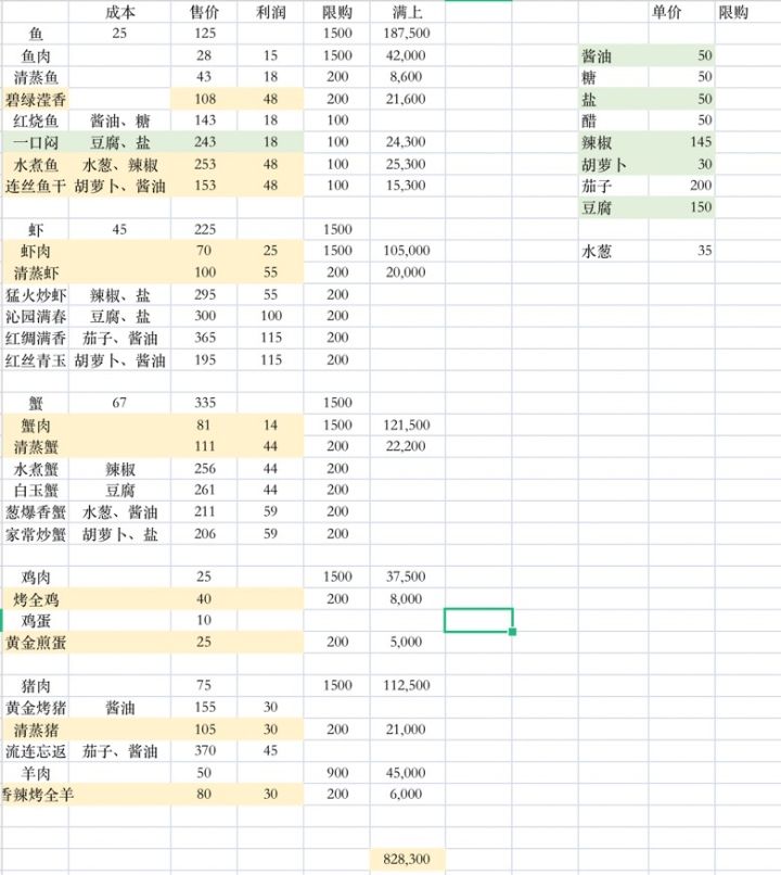 其中鱼虾蟹的成本=售价/5(因为一条鱼=5片鱼肉,做菜都是使用一片的单位)