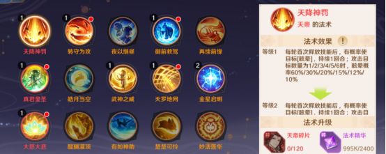 法术:每个神将有3个法术位置,分别在突破+0、突破+9、突破+13时解锁,那我们优先考虑每个神将初始只能带1个法术的情况,必带【火冒三丈】【青丘狐魂】【怒火中烧】等只适合妖界的法术,其他的就是根据不同神将的特性来针对性地搭配法术。