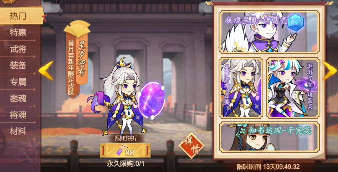 活动简介:活动期间,诸葛亮、黄月英、诸葛果、辛宪英全新系列皮肤限时折扣热销,不要错过哦!
