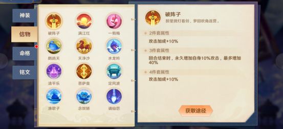 信物:最多可携带6套,要注意的是清平乐和菩萨蛮这两个有唯一特性的信物,意味着上阵神将中最多只需一人携带,带2套清平乐或者菩萨蛮的效果是不叠加的;渔歌子需要放在1号位才起作用,这些都是需要注意的。