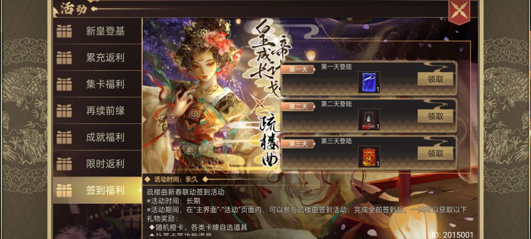 ※活动期间,在“主界面”-“活动”页面内,可以参与疏楼曲签到活动,完成全部签到后,一共可以获取以下礼物奖励: