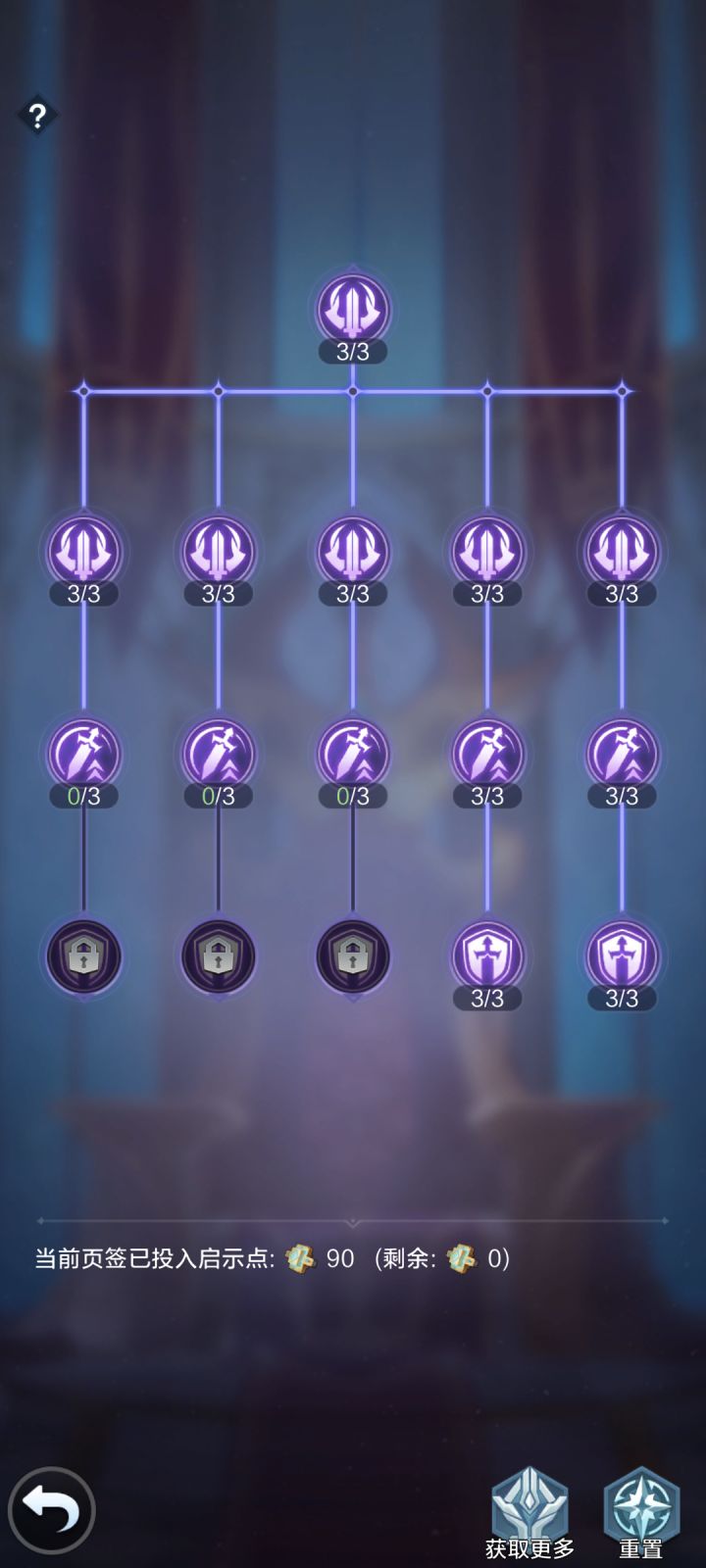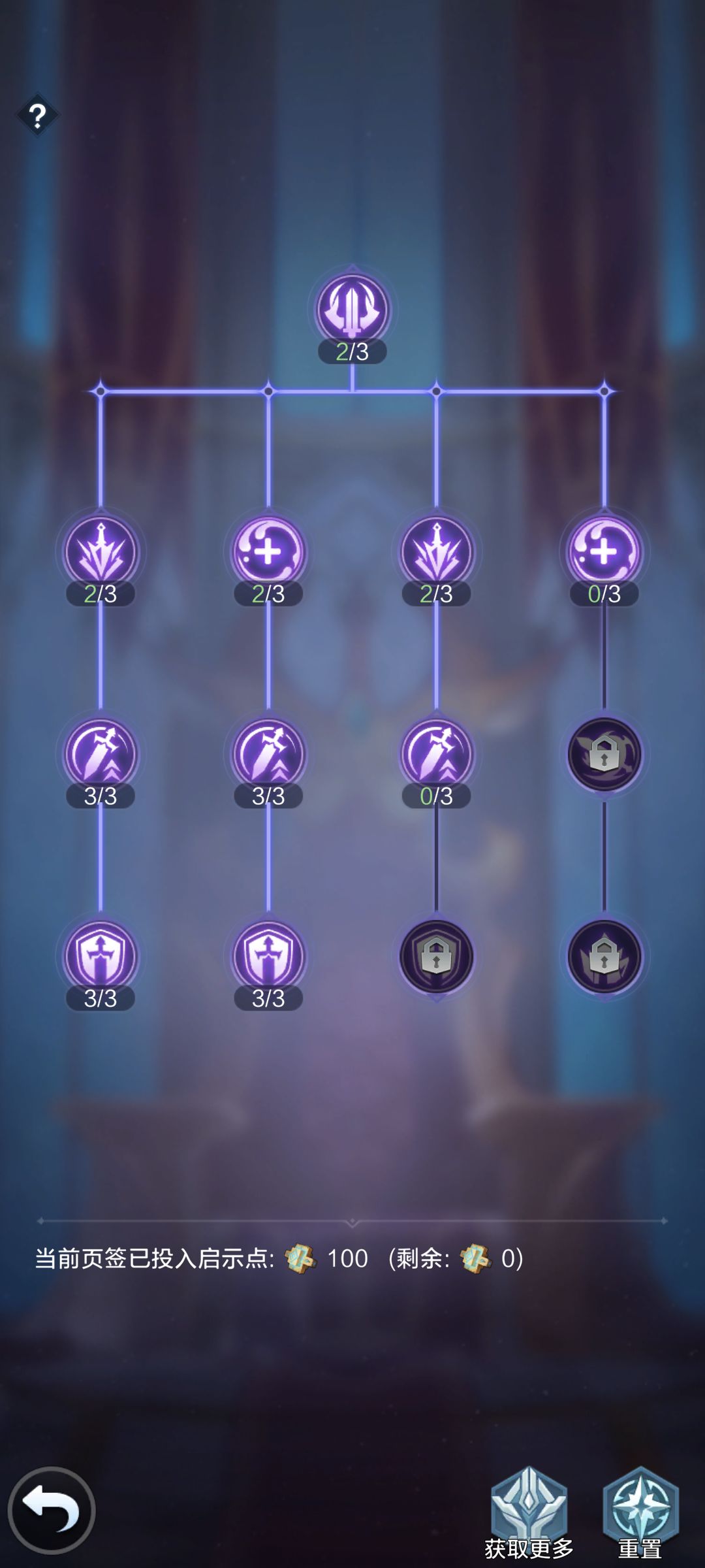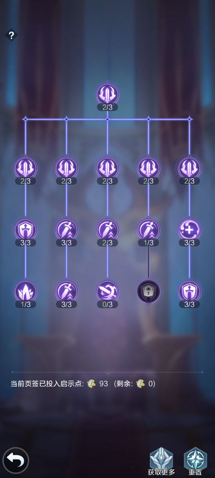 类似科技树,消耗【启示点】升级,分四页,需要前一页点一定数量才能开启下一页,以后出了个新英雄换了队伍或者点错了也没关系,可以随时无消耗重置。