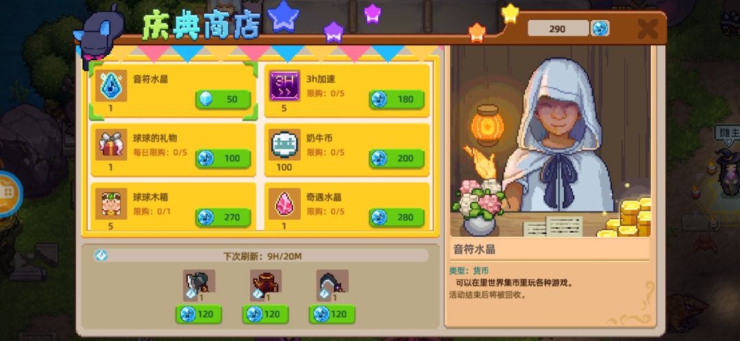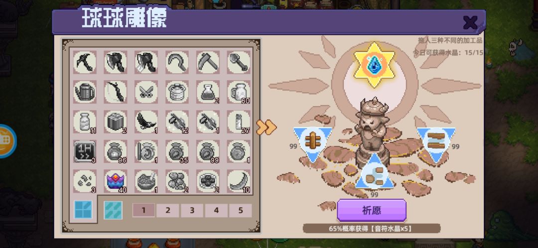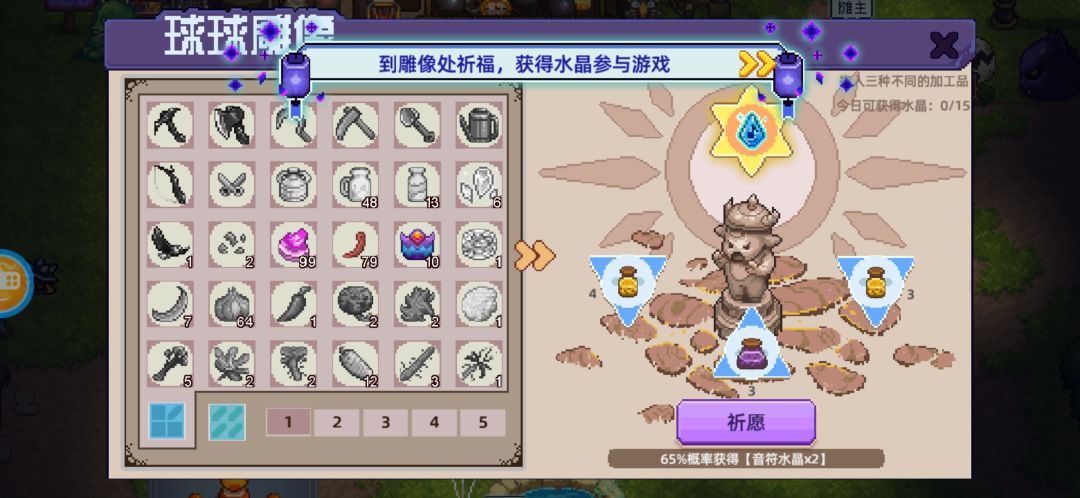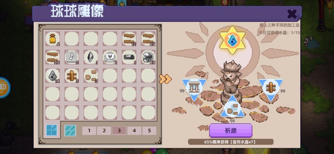 说明:每天在球球雕像可获取水晶15个,但是如果我们卡在获得14/15的时候,祈福下面显示【65%概率获得音符水晶X个】,那我们就会概率获得溢出的X个水晶。