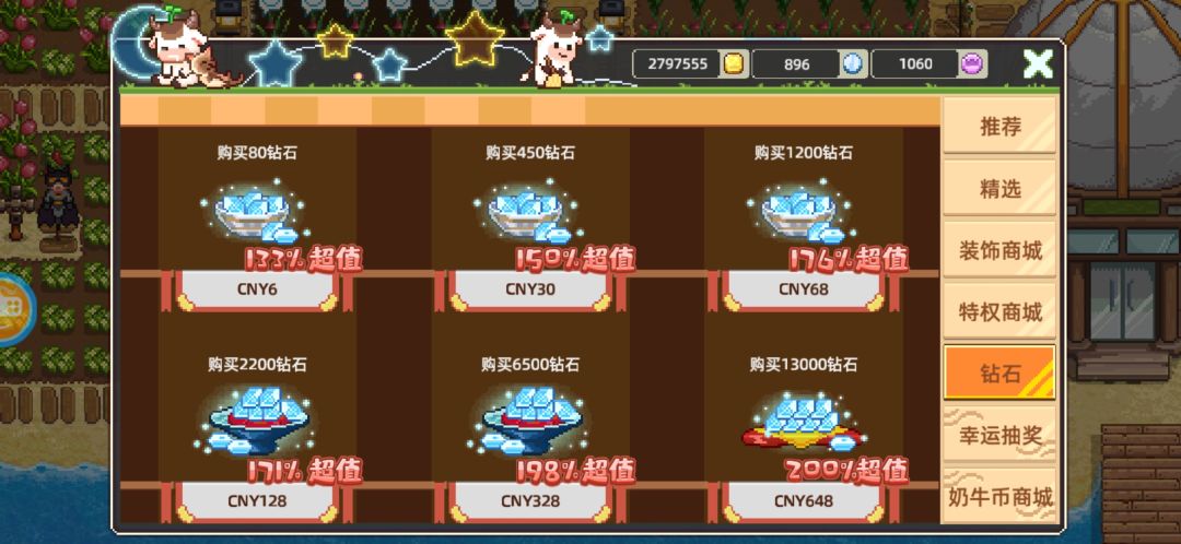 奶牛杯砖石800+800+6元80+80=1760砖石