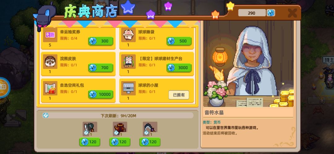 也就是说空间礼包,建材生产,浣熊皮肤,球球睡袋必得。(球球小屋没有什么用我觉得)