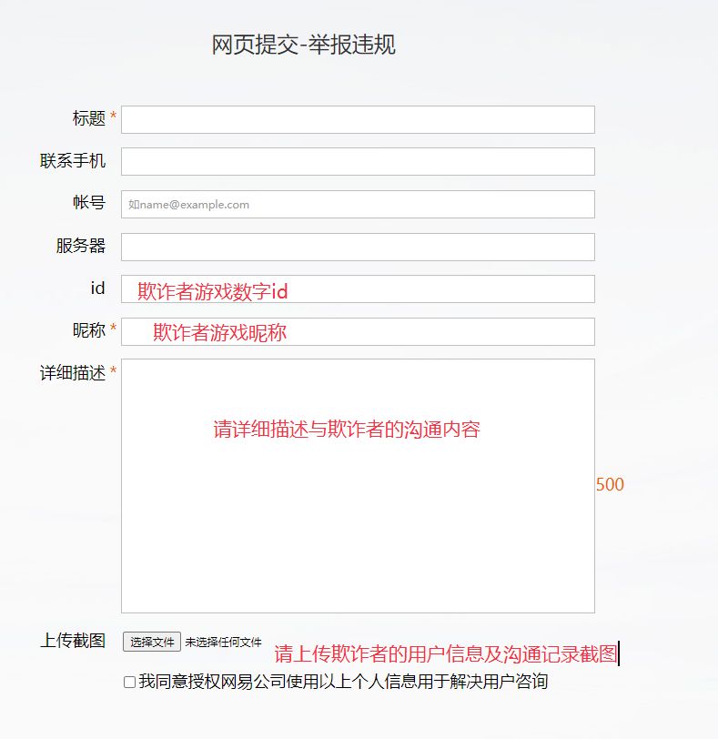 欺诈者游戏数字id、无遮挡无剪裁游戏内双方沟通截图、无遮挡无剪裁游戏外双方沟通截图、欺诈行为(单方赠礼、账号被盗、拉黑等)截图、无遮挡无剪裁游戏外欺诈者账号信息截图,示例如下