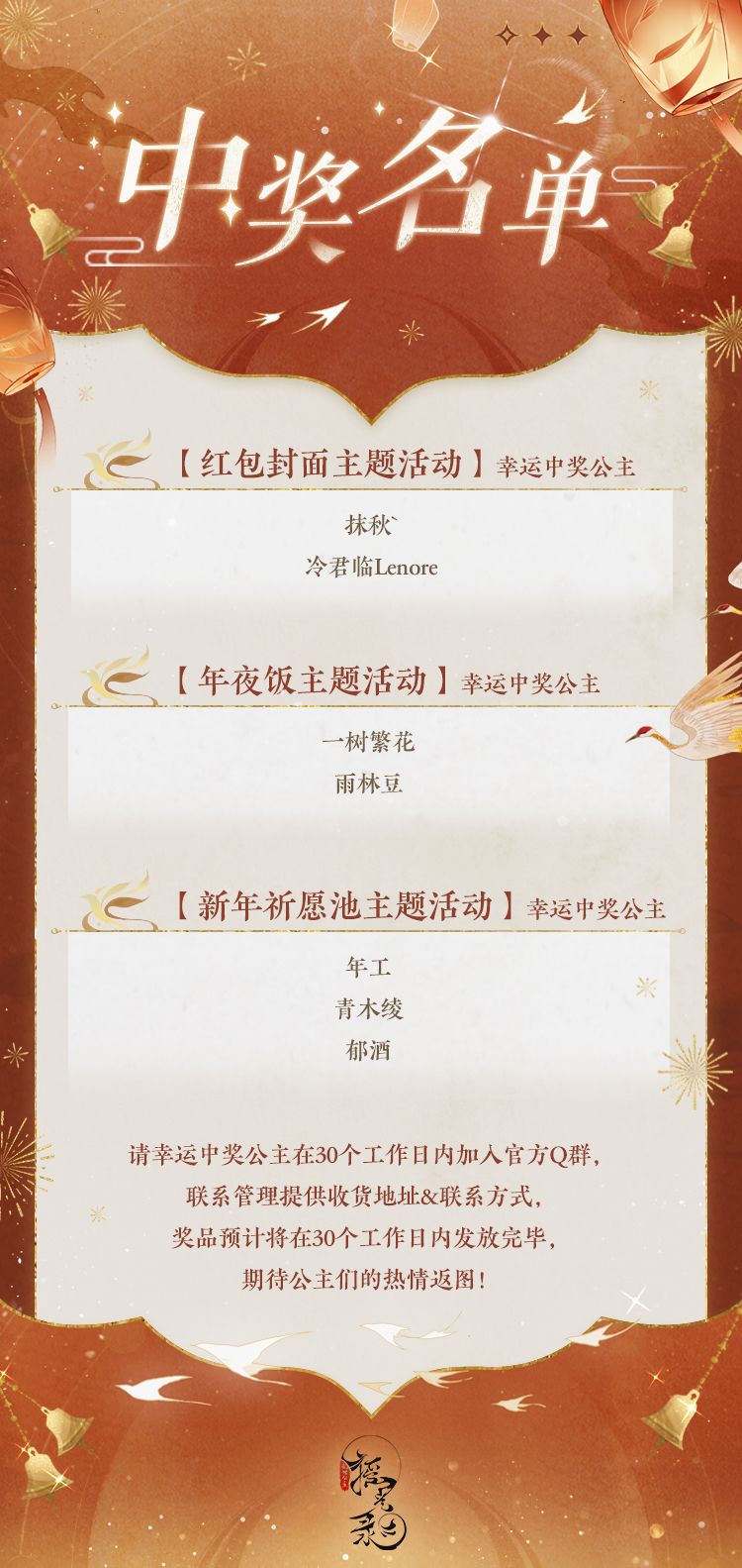 新年期间活动中奖名单已出炉~请幸运中奖公主在30个工作日内添加掌柜的的Q号【Q号:2437985205】,并提供您的【Tap主页截图】以及【收货姓名、地址及联系方式】~在添加掌柜的时记得备注来意哦:TAPTAP+获奖昵称