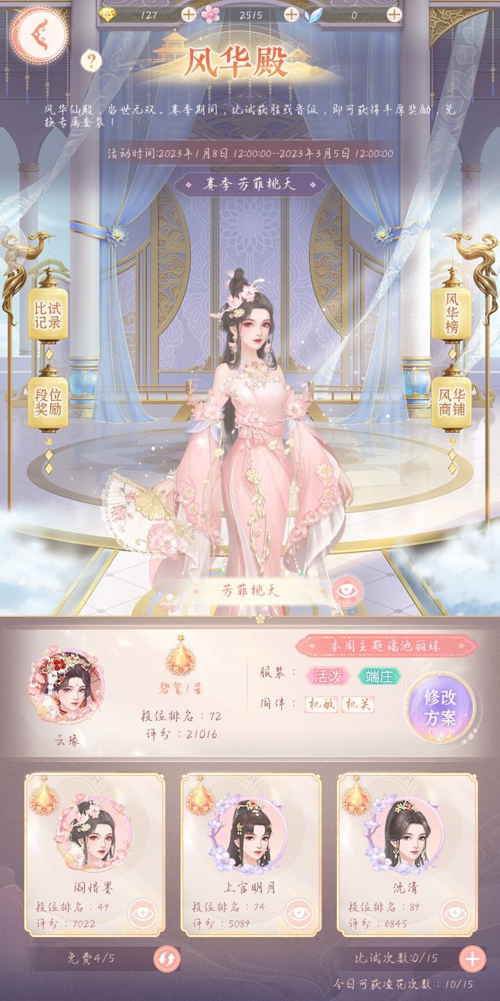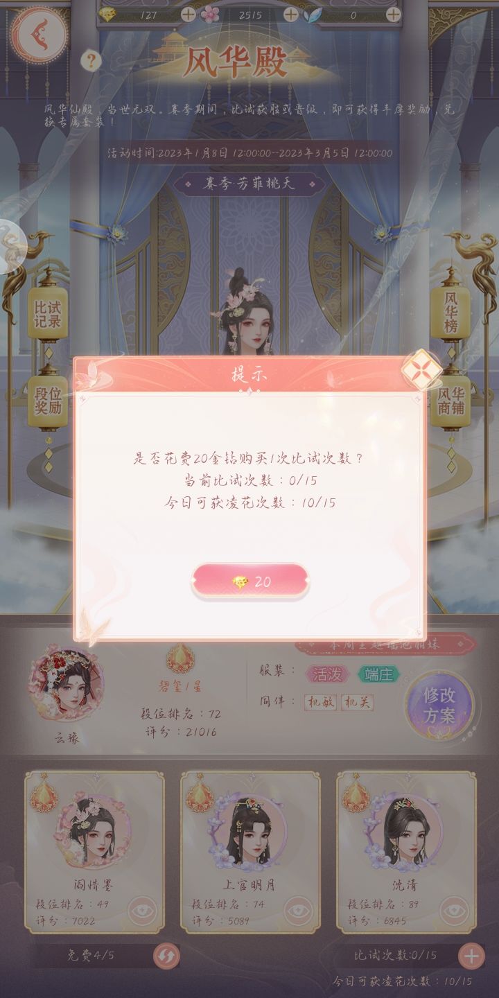 ●【在风华殿可向系统推荐的对手发起比试,评分高的一方获胜。每天只有前15次发起比试,可获得“凌花”道具。比试胜利可获得10个,比试失可以获得5个。】
