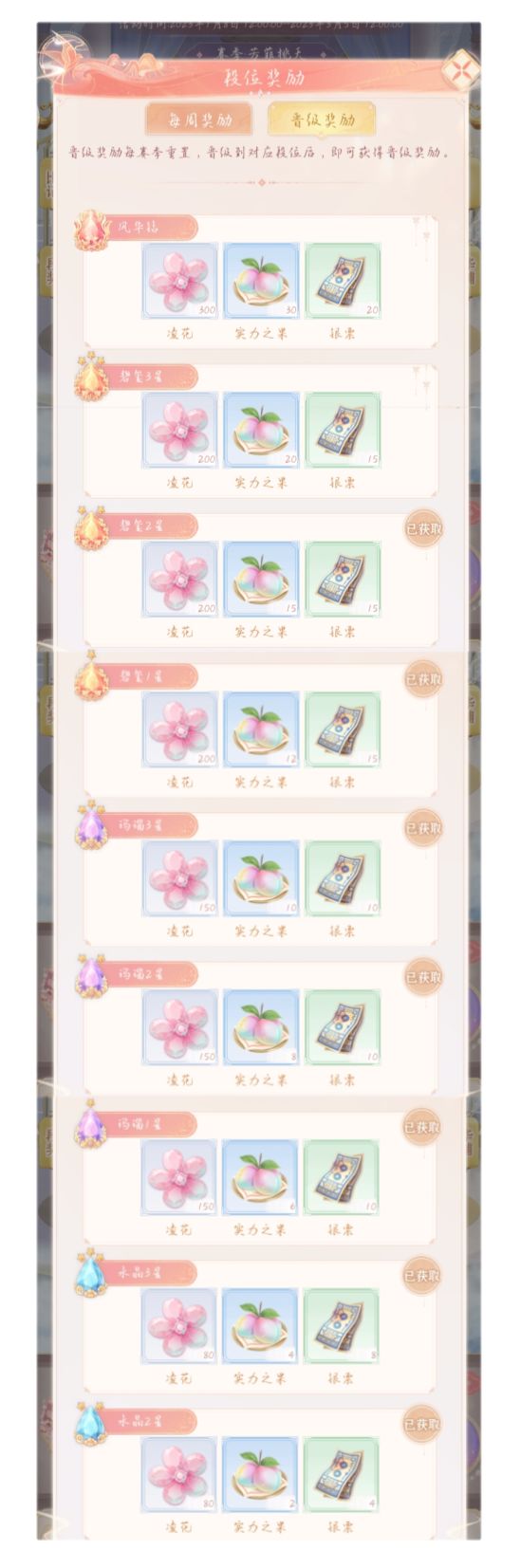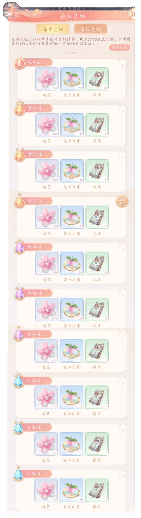 ●每周六晚上22:00,将根据仙主当前所在段位结算每周奖励,段位越高,每周奖励越丰厚。本周内发起过比试即可获得周结算奖励,凌花、绚叶将自动发放至风华殿、道具将自动发放至背包。