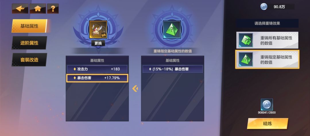 重铸属性需要消耗一定量的银币,选择想要改变基础属性的装备,然后可选择重铸装备所有基础属性的数值,或重铸指定基础属性的数值,还可以对装备契约点进行重铸。属性重铸后若对重铸后的数值不满意,选择原属性再次消耗银币进行重铸即可。