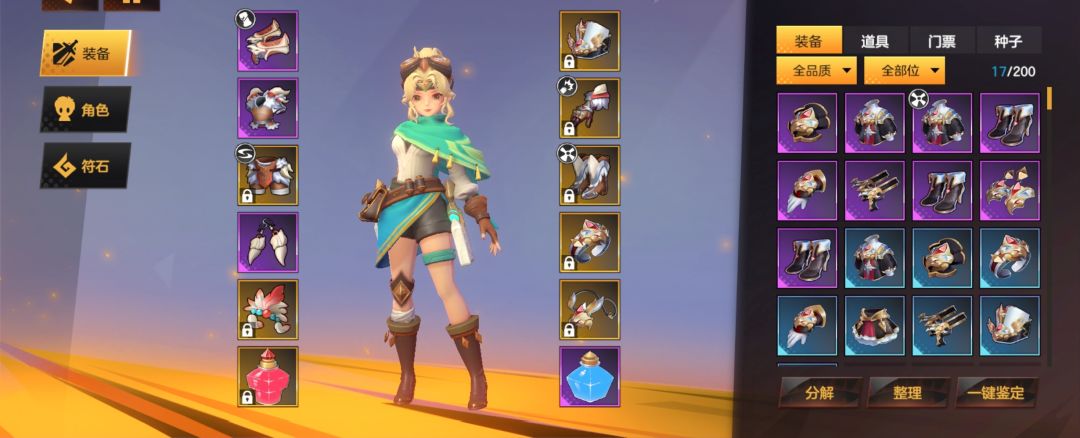 装备主要分为:武器、上衣、下装、帽子、手套、鞋子、耳环、戒指、项链、饰品、生命之瓶、能量之瓶