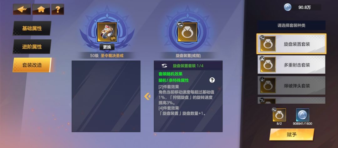 在装备提升——套装改造界面,选择放入想要改造的装备,然后选择想要添加的套装效果的共鸣石,最后点击界面右下方赋予按钮,即可成功进行套装改造。