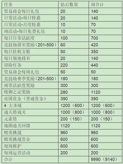 目前每周大概可以获得9140~ 9990 钻石,但是有一些前提: