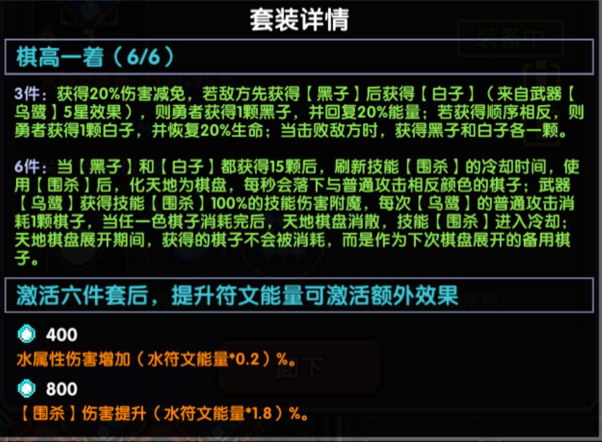 六件套效果:当玩家身上有15层白+15层黑棋子后,即可使用【围杀】进入爆发状态,爆发状态会自动每秒丢出当前身上棋子颜色相反的棋子进行输出。例如爆发时玩家普攻丢白棋子,机制会自动丢黑棋子,爆发时有两种输出形态,具体看玩家自己的操作习惯与手法,可以长按平A无脑按【问道】来切换棋子颜色,另一种输出法师是持当前颜色棋子丢14颗,当buff栏只剩当前颜色棋子一颗的时候按【问道】切换另一颜色棋子并全部A出去直至爆发结束。