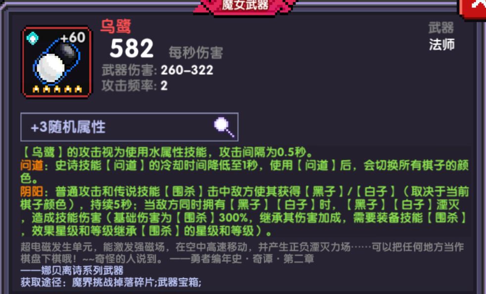 一、魔女武器:首先,因为武器效果,所以污渍法还是可以带缴械套,带了缴械披风还是能平A出来。五星效果则是污渍法的未爆发时的伤害组成,一个怪物必须同时拥有白+黑棋子造成湮灭效果才有伤害。