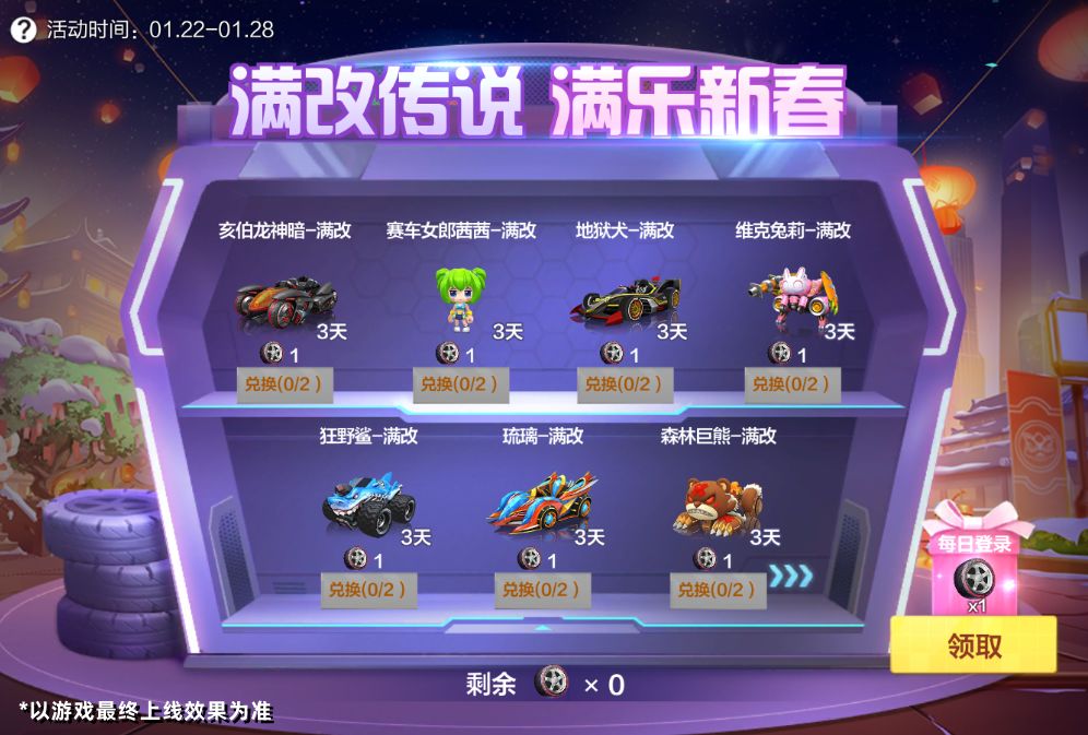1月22日-1月28日,福利站将开启【满改传说车】活动,活动期间每日登录游戏即可获得赛车轮胎碎片,玩家可消耗指定数量的赛车轮胎碎片兑换满改传说车。活动结束后,赛车轮胎碎片将会被回收,请车友们注意活动时间噢~